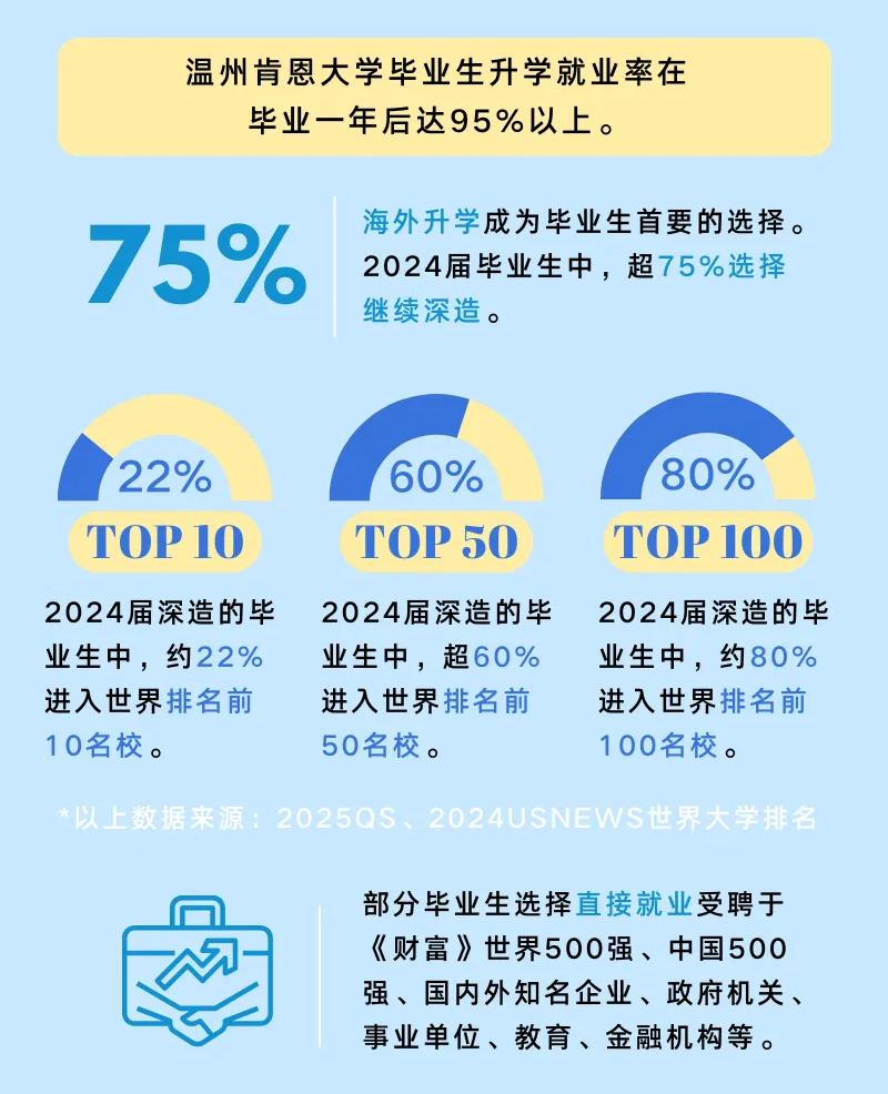 近年来,温肯因高质量的国际化教学水平和优异的学生培养成果,深受考生、家长和用人单位的认可。2024届毕业生整体深造率高达75%,可与国内顶尖院校相媲美。其中超过60%毕业生进入世界排名前50的高校,约80%被世界前100强院校录取。