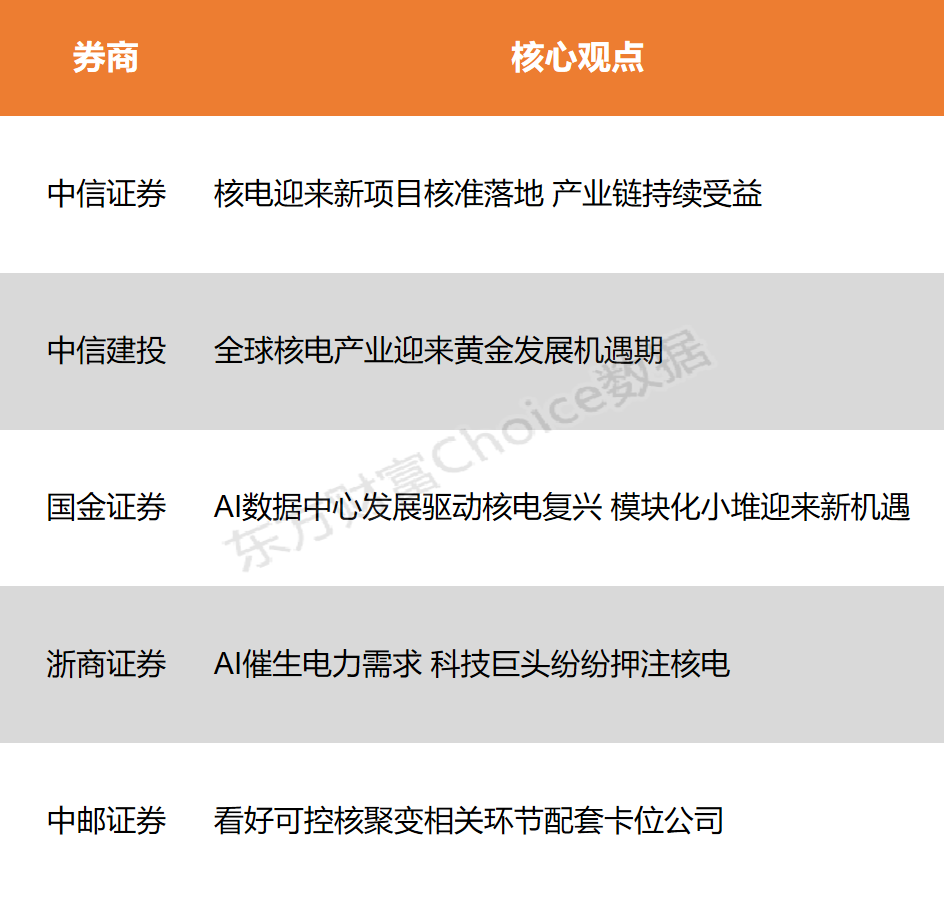日前,国务院常务会议核准10台核电机组建设项目易云达,保持常态化审批节奏。国家核安全局局长董保同表示,我国核电已进入大规模建设高峰期,已颁发建造许可证的机组31台,核准待建机组13台,未来还将有新的机组核准,在建规模高于世界其他国家的在建规模总和。中信证券表示,核电迎来新项目核准落地,产业链持续受益;中信建投认为,核电低碳和高能量密度优势显著,全球核电产业迎来黄金发展机遇期;浙商证券指出,面对AI大模型训练推理对电能需求的激增,各方正将目光投向核能以期寻求能源供应的解决之道。