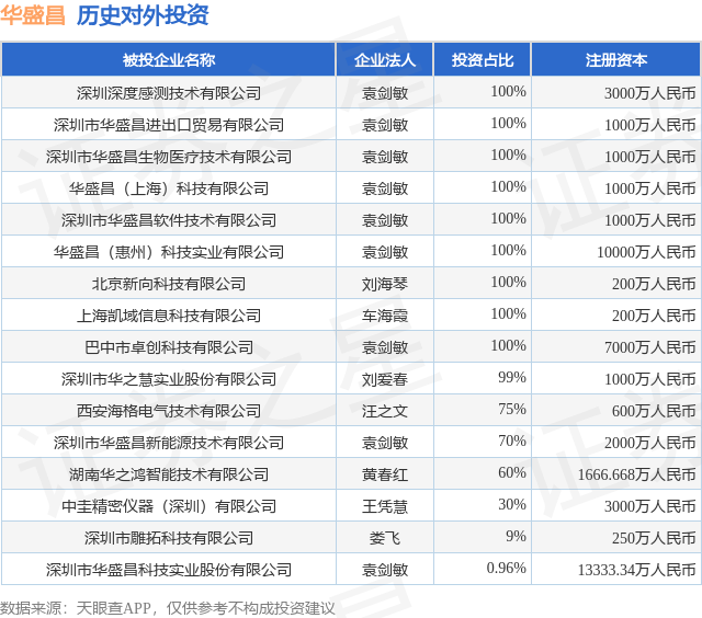 本站消息,根据天眼查APP显示资本E家,华盛昌(002980)新增一起对外投资事件,被投资公司为深圳市华盛昌科技实业股份有限公司,法定代表人袁剑敏,投资占比为0.96%。该公司从事仪器仪表制造业,注册资本为13333.34万人民币。目前资本E家,华盛昌共存在对外投资16项,详见下表: