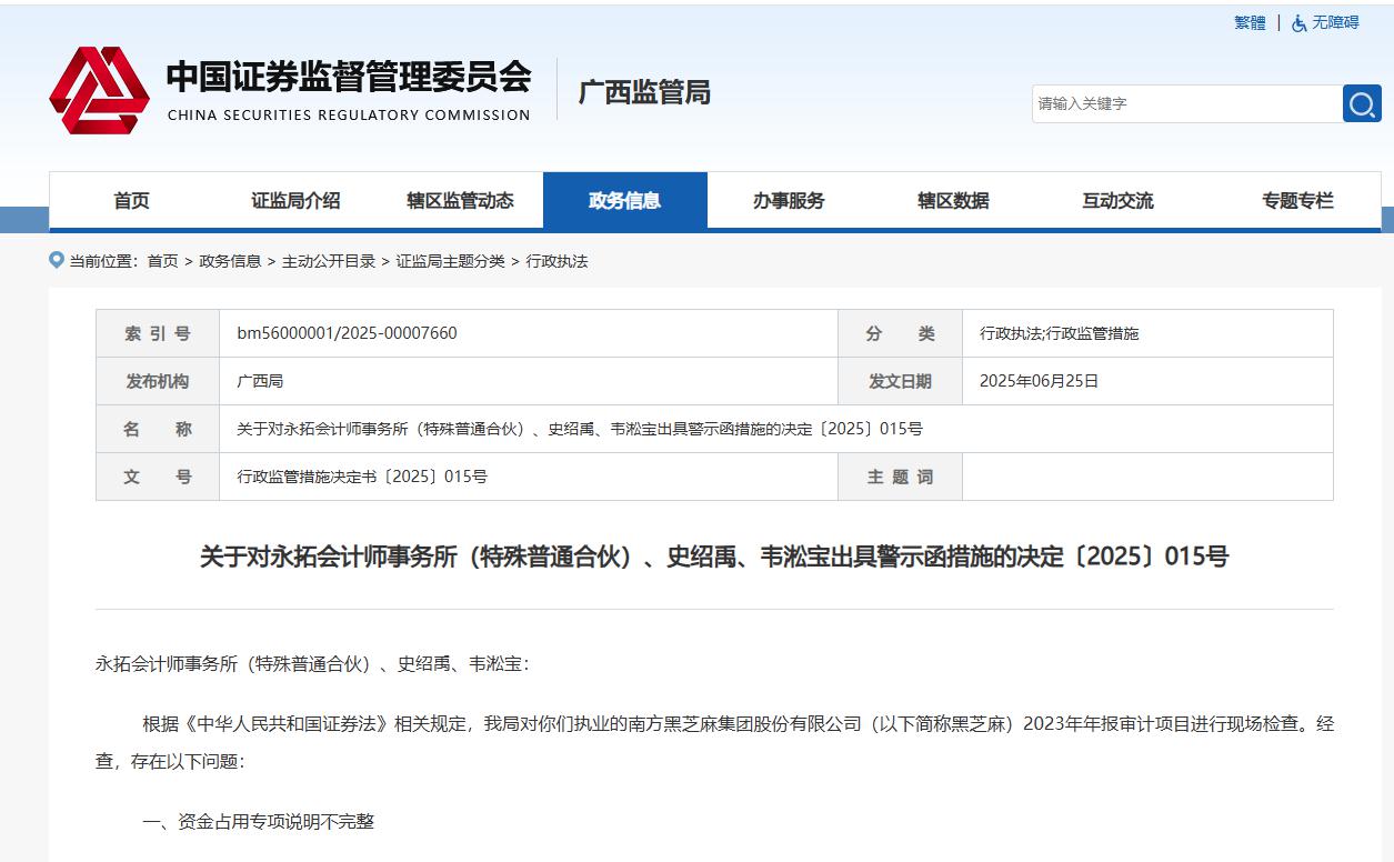 25日,广西证监局网站发布的《关于对永拓会计师事务所(特殊普通合伙)、史绍禹、韦淞宝出具警示函措施的决定〔2025〕015号》(下称《警示函》)显示,根据《中华人民共和国证券法》相关规定,广西证监局对永拓所、史绍禹、韦淞宝执业的南方黑芝麻集团股份有限公司(以下简称黑芝麻)2023年年报审计项目进行现场检查。