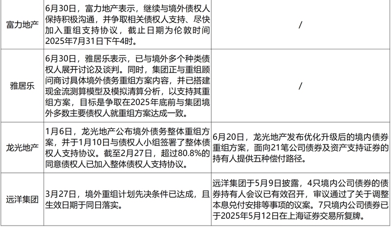 动作稍有滞后的雅居乐也表示在年内就重组方案达成一致。6月30日,雅居乐方面称,已与境外多个种类债权人展开讨论及谈判。同时,集团正与重组顾问商讨具体境外债务重组方案内容,并已搭建现金流测算模型及模拟清算分析,以支持其重组方案,目标是争取在2025年底前与集团境外多数主要债权人就重组方案达成一致。