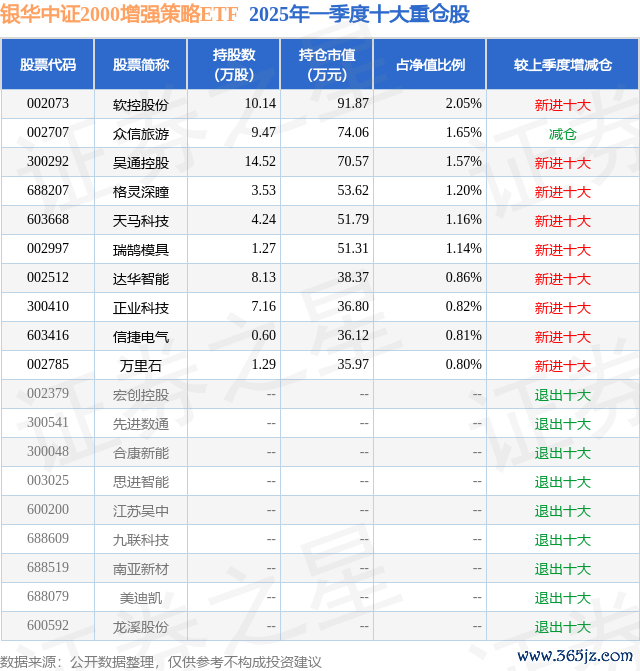 从基金规模来看海通众合,银华中证2000增强策略ETF基金2025年一季度公布的基金规模为0.45亿元,较上一期规模6059.23万元变化了-1577.95万元,环比变化了-26.04%。该基金最新一期资产配置为:股票占净值比96.91%,无债券类资产,现金占净值比3.22%。从基金持仓来看,该基金当季前十大股票仓位达12.06%,第一大重仓股为软控股份(002073),持仓占比为2.05%。