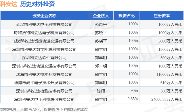 本站消息,根据天眼查APP显示,科安达(002972)新增一起对外投资事件,被投资公司为深圳科安达电子科技股份有限公司,法定代表人郭丰明顺发配资,投资占比为0.85%。该公司从事仪器仪表制造业,注册资本为24600.88万人民币。目前,科安达共存在对外投资10项,详见下表: